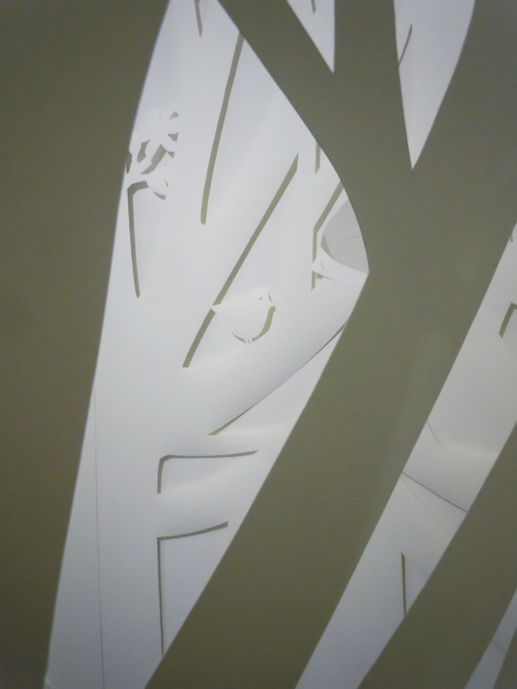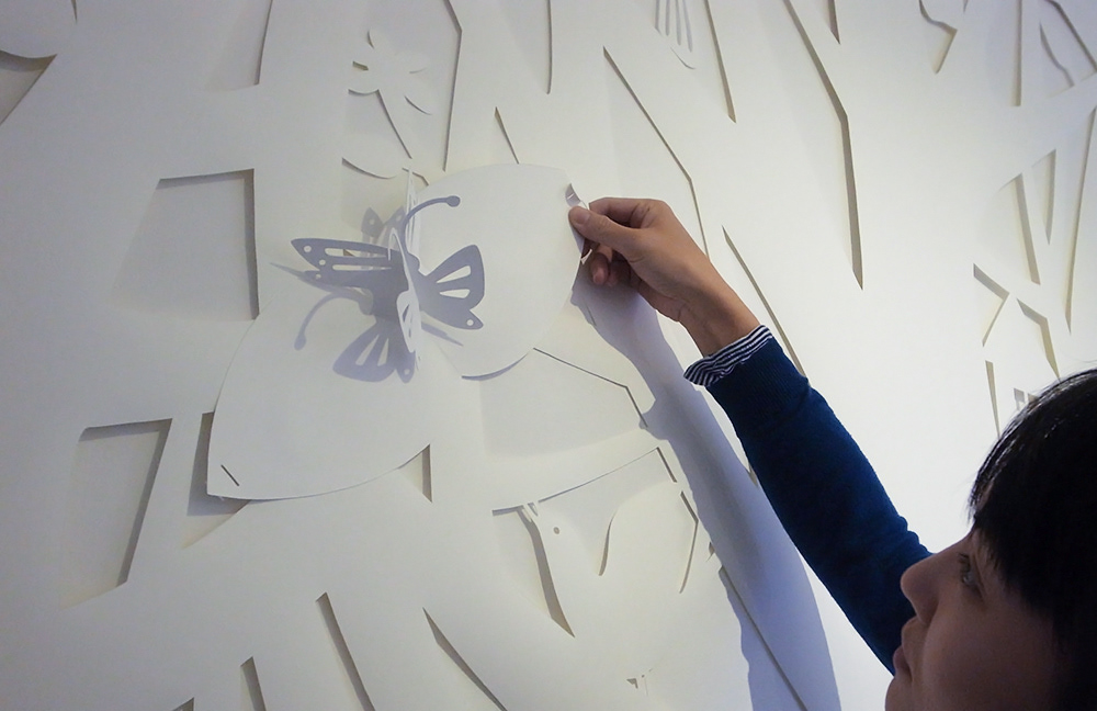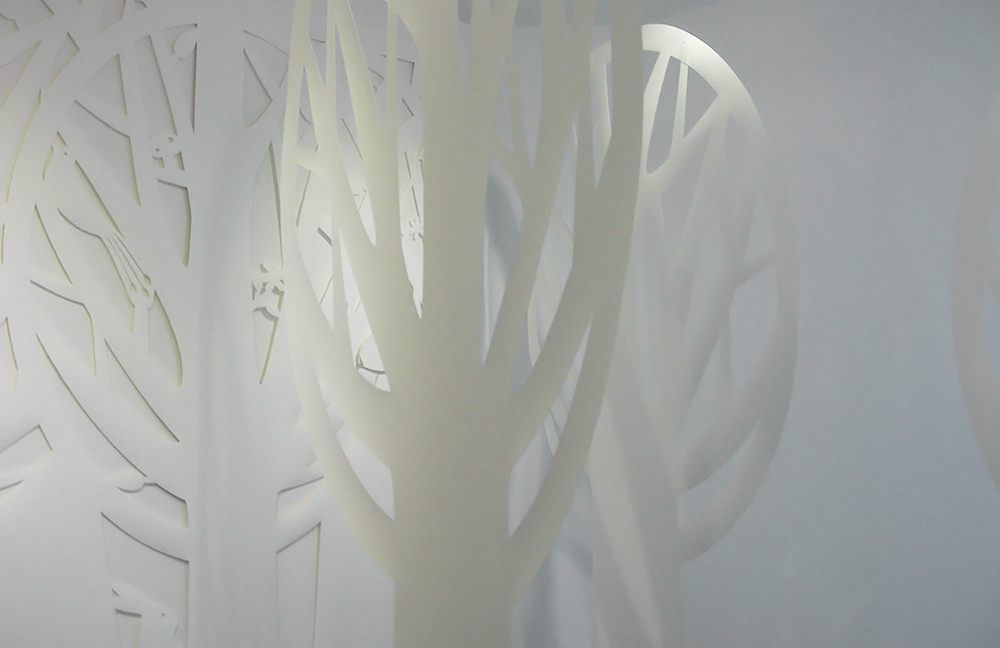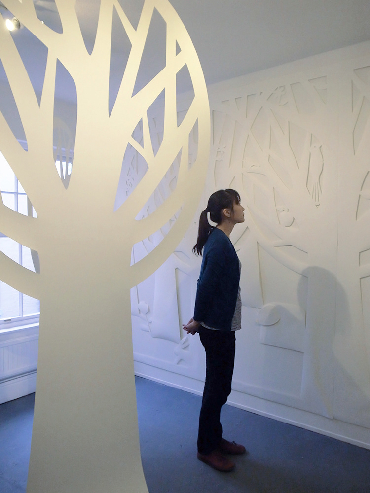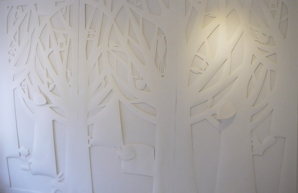 Paper sculpture for my solo exhibition. As you go through the white forest, you'll find some pop-up wildlife behind the leaves.